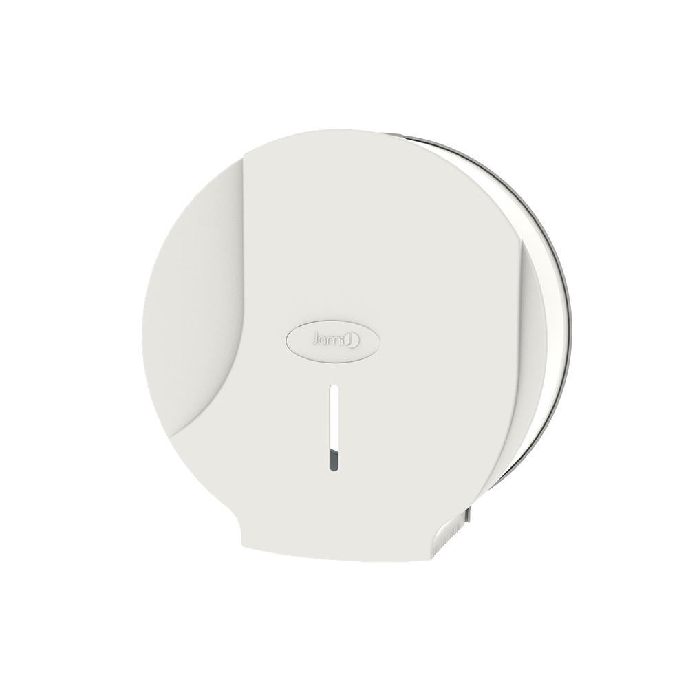 Dispensador de papel higiénico para rollo industrial Ø200mm con visor de nivel y cierre de seguridad. De ABS en acabado blanco.